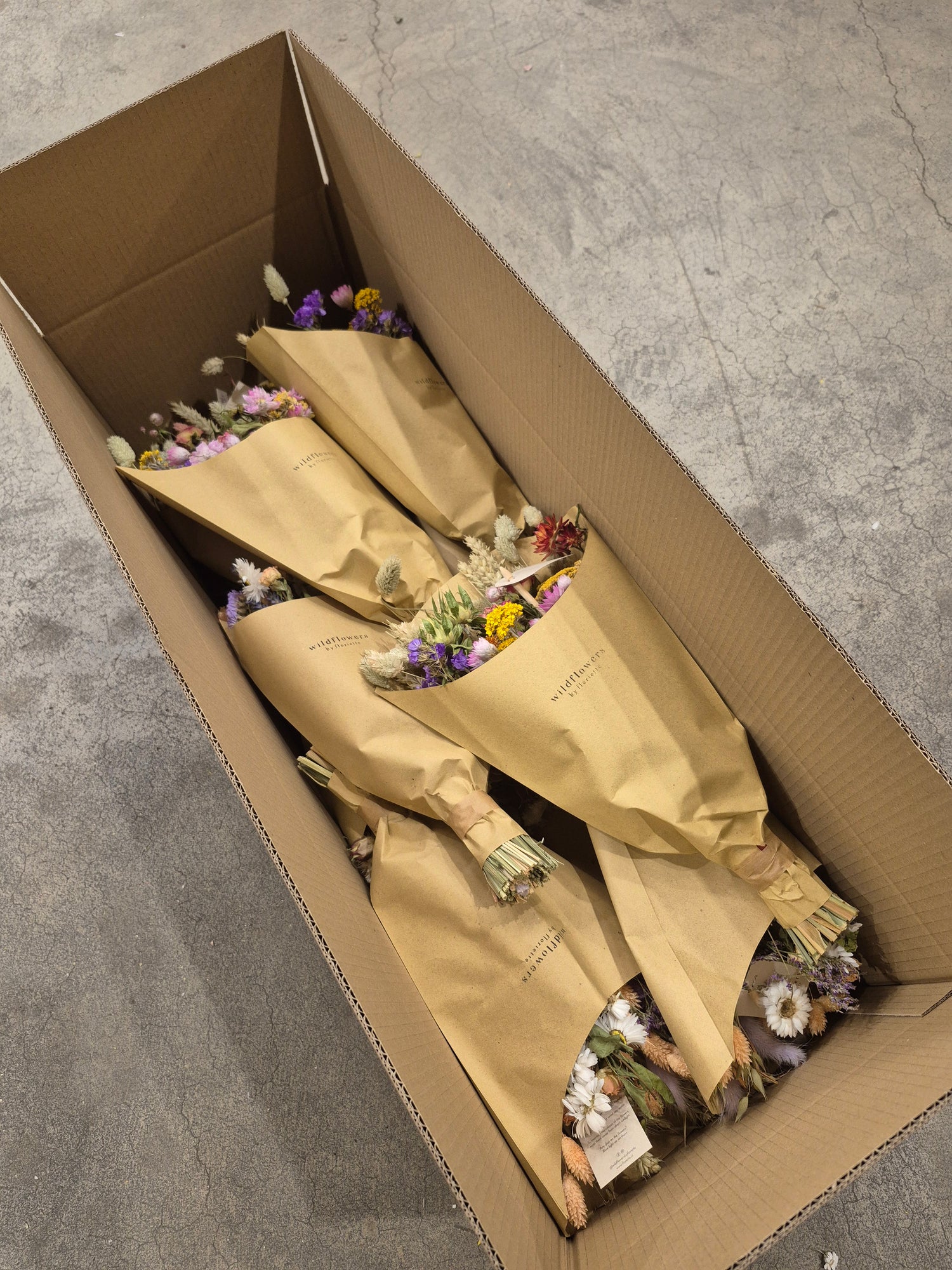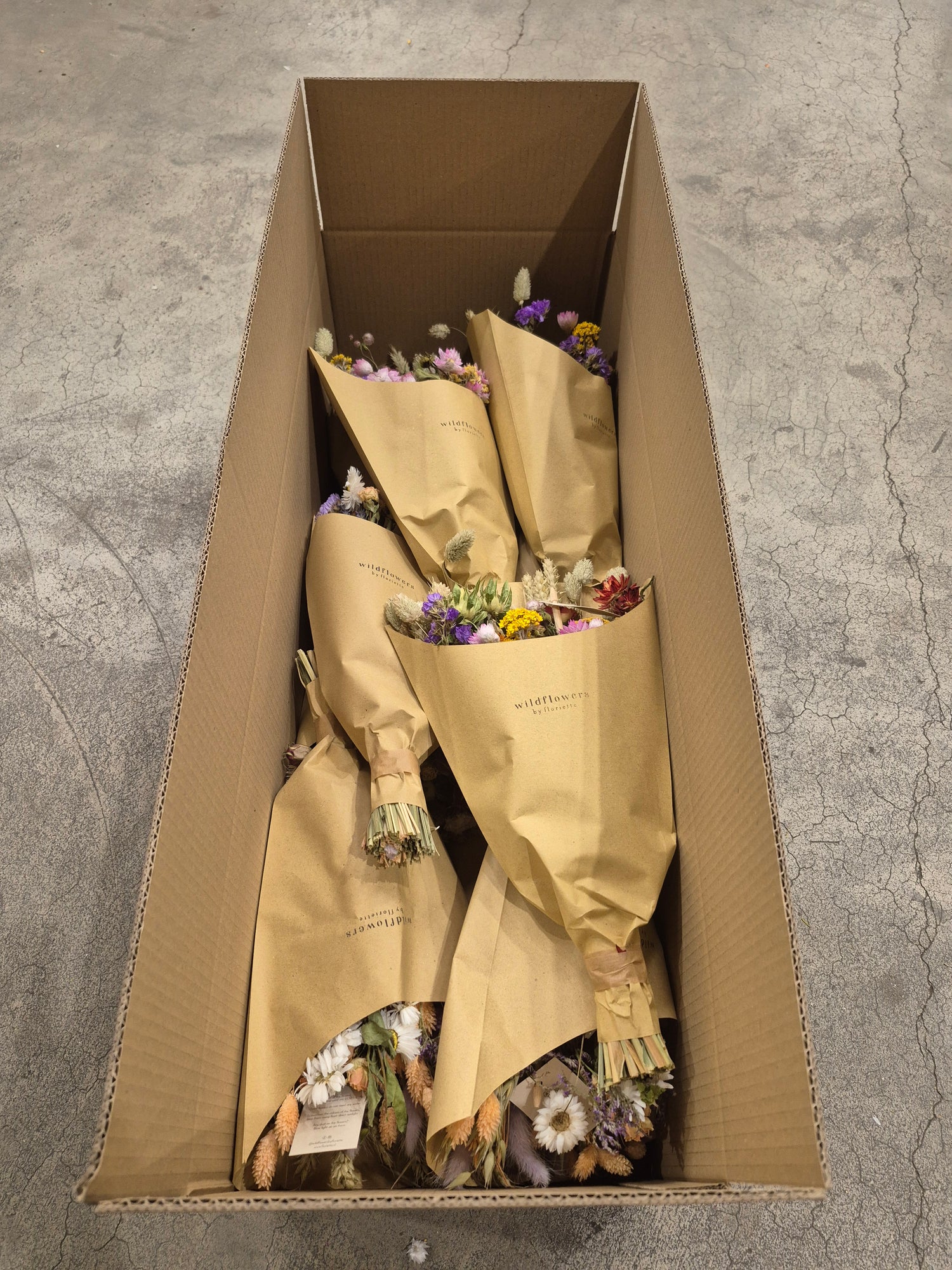 - This ready-to-retail dried flower bouquet comes wrapped in kraft paper.