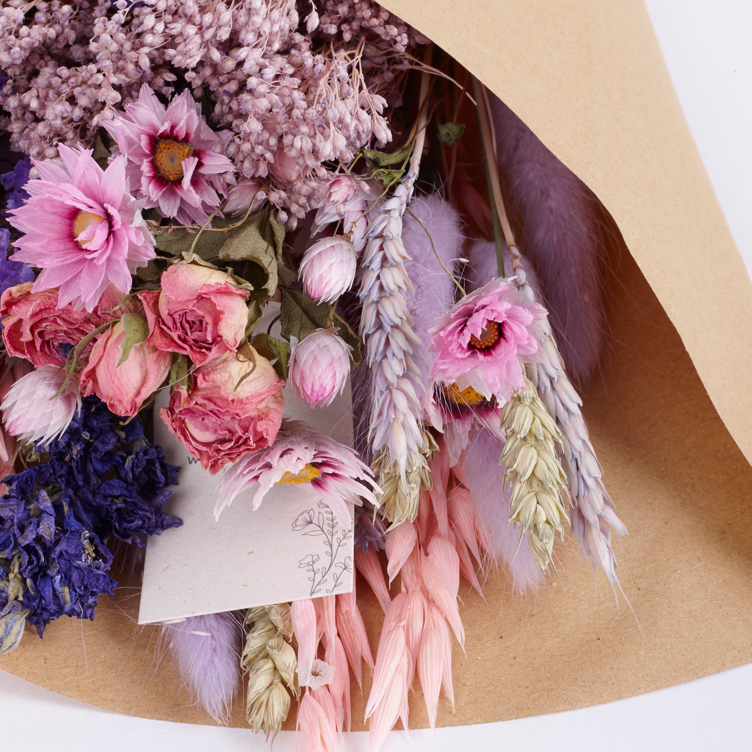 - This ready-to retail dried flower bouquet comes wrapped in kraft paper.